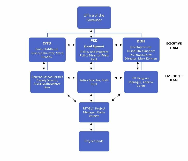 The RTT-ELC grant is jointly managed by three state agencies – the Public Education Department, Children Youth & Families Department and the Department of Health. Each state agency is represented at the various levels of the governance structure: